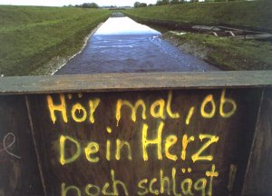 3. コンクリートで作られたエムシャー排水路、 「心臓の鼓動が聞こえるか(死んでしまってもう聞こえないだろう)」と落書きされている